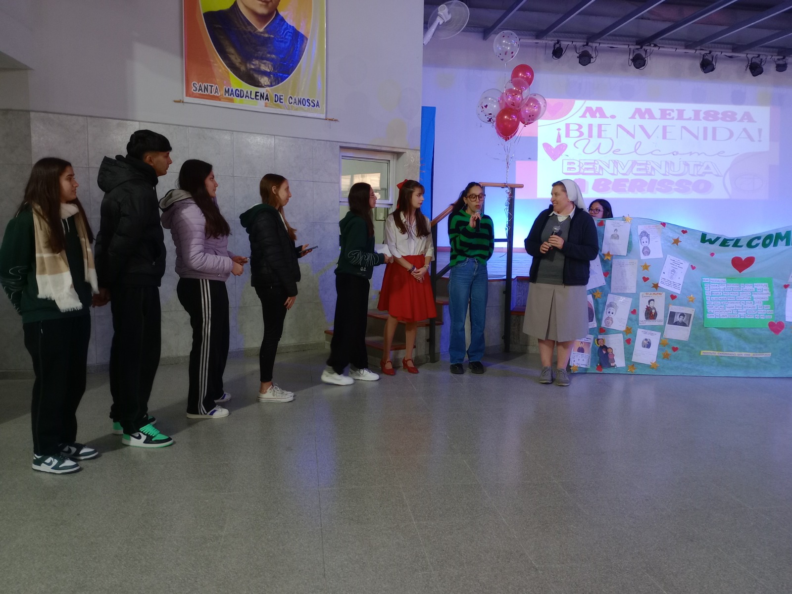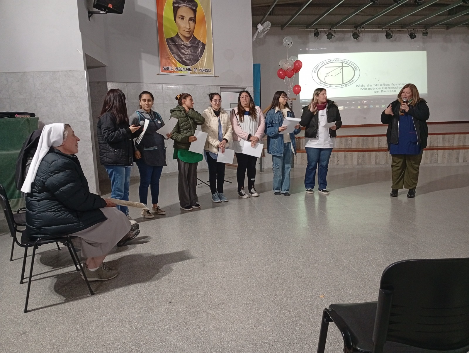 El lunes por la mañana, la Madre Melissa visita el Nivel Secundario del Canossiano San José compartiendo con docentes y alumnos en el salón de la escuela. Los alumnos presentaron el hermoso y pintoresco baile “intercolectividades”, característico de la realidad multicultural de la ciudad de Berisso, y participaron en un ameno intercambio de preguntas y respuestas. La Madre Melissa les dirigió un cálido y esperanzador mensaje, animándolos a valorar todo lo que tienen, esforzándose en los estudios y a dar siempre lo mejor de sí mismos. Por la tarde visitó el nivel inicial y primario donde fue recibida con mucha alegría por los niños, quienes le cantaron con mucho entusiasmo en español, italiano e inglés la canción: “Magdalena hoy nos invita”.  Finalmente, compartió un emotivo encuentro con las alumnas del nivel superior: de los Profesorados de Nivel Inicial y Primario.  Las estudiantes prepararon un video en el que mostraron aspectos destacados de la ciudad de Berisso y de la historia del Instituto. Además, las alumnas de 4º año ofrecieron hermosos testimonios sobre su paso por la institución y los valores aprendidos en ella.  La Madre Melissa agradeció y compartió con los alumnos con su habitual sencillez y alegría su testimonio como docente en una escuela de Malawi (Africa)